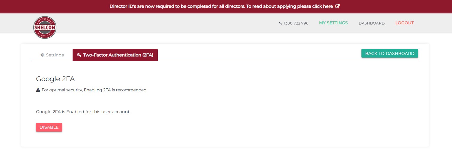 You will receive an automated email as well verifying that 2FA has been enabled on your Shelcom account, and subsequently will receive an automated email should you choose to disable 2FA.