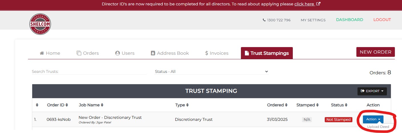 Find the Trust order from the list, select the action button, and click to upload the signed deed: